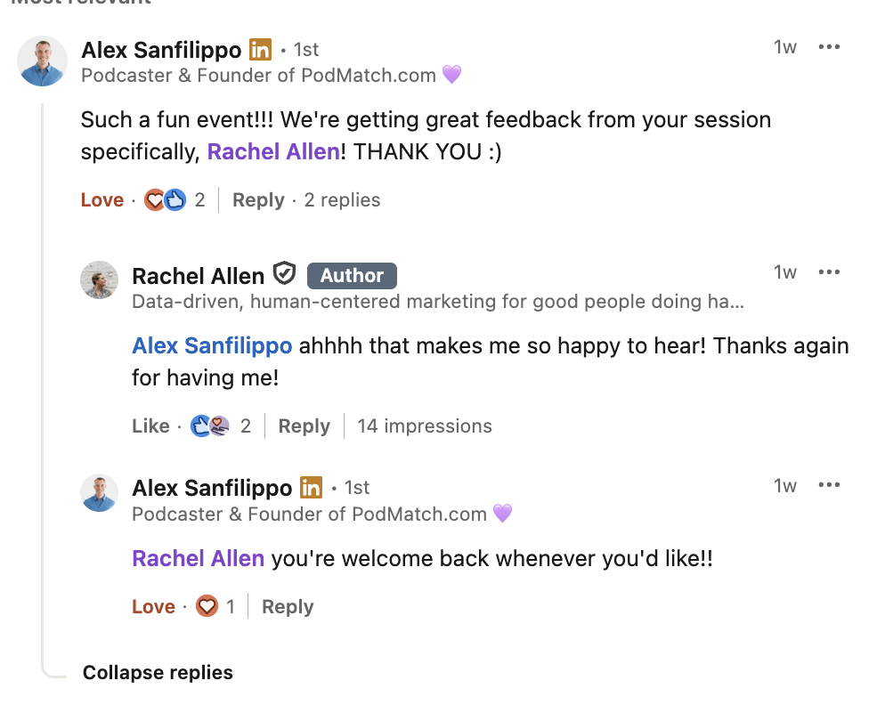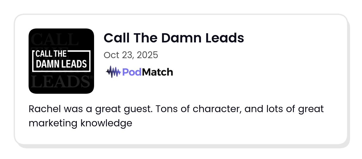 Oh right, and I also got invited to speak at Podmatch’s quarterly conference, and booked new clients without ever having to sell them directly, formed a network of hosts who regularly recommend me to their audiences, and created over 3 years’ worth of evergreen social content, along with a whole bunch of other goodness I could have never predicted.